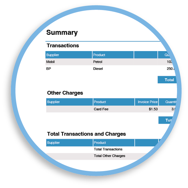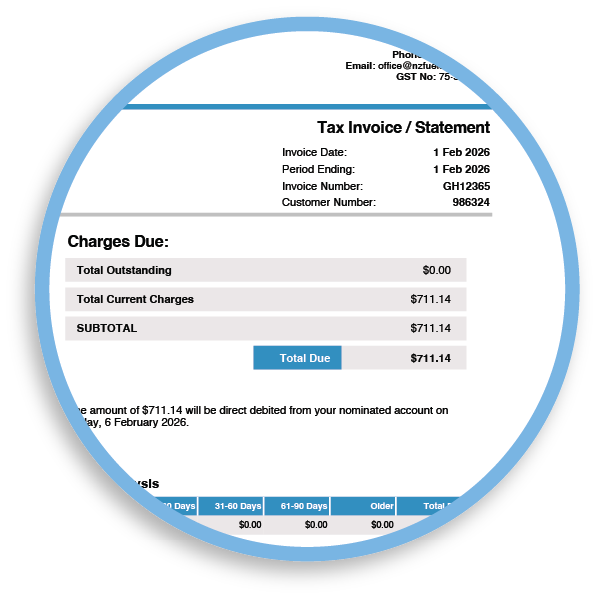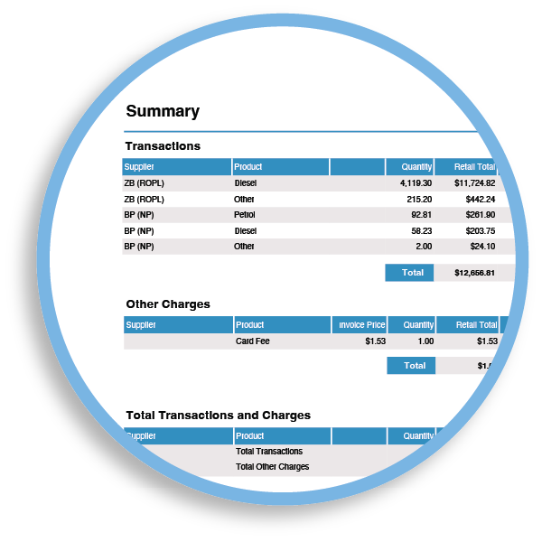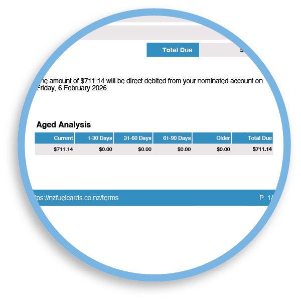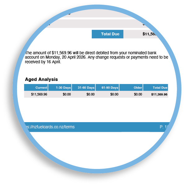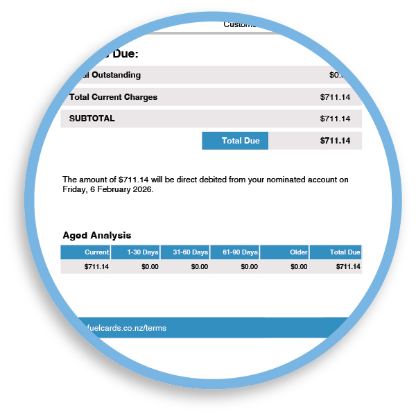 - Other charges: account-level fees (for example card fees and other NZ Fuel Cards charges)
