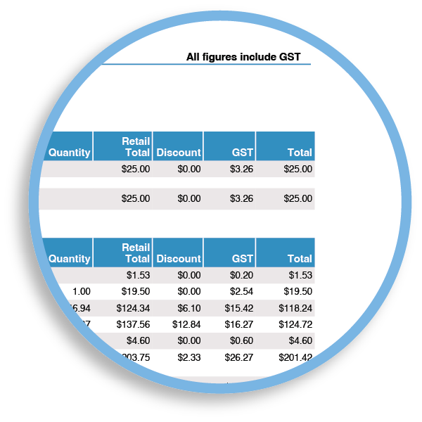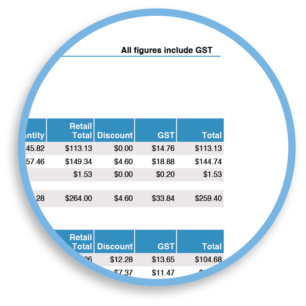 Most values are shown GST-inclusive, but the Invoice Statement totals also show the GST content as its own line item.